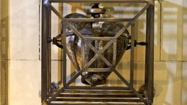Saint Lorcán’s skull was brought to England in 1442 by a nobleman named Sir Rowland Standish (relation of Myles Standish) who had fought at Agincourt. The bones were interred at the parish church of Chorley in England, now named St. Laurence’s. The bones disappeared in the Reformation under Henry VIII’s rule. Although mainly revered by Roman Catholics, his heart was preserved in the Anglican-affiliated Church of Ireland’s Christ Church Cathedral, Dublin from the 13th century (pictured above) until 3 March 2012 WHEN IT WAS STOLEN. The Dean of Christ Church Cathedral and the Diocese of Dublin and Glendalough, the Most Reverend Dermot Dunne stated “I am devastated that one of the treasured artifacts of the cathedral is stolen”. He added “It has no economic value, but it is a priceless treasure that links our present foundation with its founding father.”The heart (as it was before) is pictured here…the thieves opened the iron cage and stole the iron heart with the actual heart inside it….