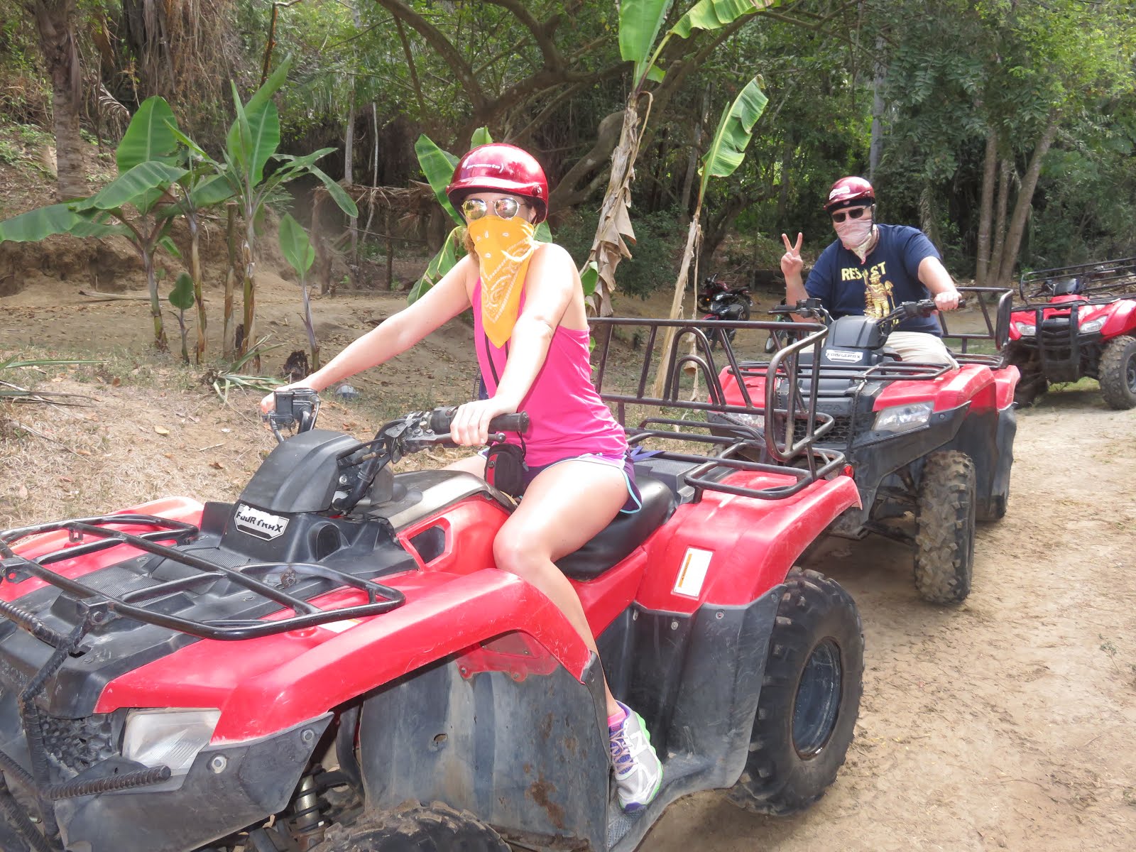 Our first official activity!! ATVING through the JUNGLE! We decided to go with the travel company http://michaparrita.com/as they are all over here and seemed to be very nice and most importantly with Kim and Kayne came to Sayulita, they went ZIP LINNING here (proof below). We had a very small group, just Derek and I and then another couple from San Francisco, CA (originally from Iowa – small world!) and our guide ended up being from Nebraska. Our tour started at 9:00 but we were there early at 8:20 with café con leche and water. At 9:00 we took a van to the Mi Chaparritta area where we go a brief lesson on the ATVs (which were semi-automatic which was new to me) and we were asked if we wanted the “fun” ride or not. Of course we were in for the fun … then we were off. There is something scary but also freeing about doing tours in a country where there are not all the rules and regulations. We started on the “highway” and then we took a left and we were in the Jungle.