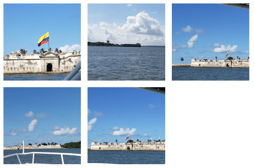 Guess we hit the jackpot! We arrived after an hour boat ride where I did ok-took Dramamine and had my wrist pressure point bracelets. On the way we slowed to see The Castillo San Fernando which guard the entrance to Cartagena’s Bay.