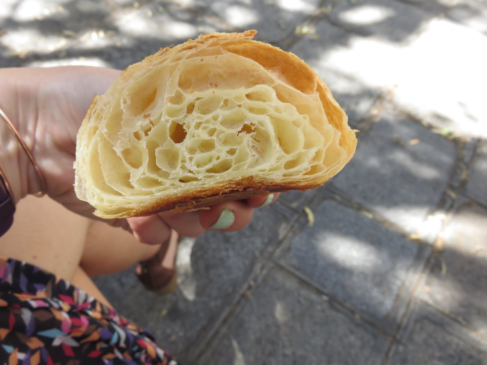 😋 RacheyZee’s Triscuit of Information: What a good croissant should look like on the inside, like honey comb. Jennifer made a great point. croissants and baguettes are so much better in Paris because of the butter however something to keep in mind, there are only a couple ingredients in these and they vary so much from store to store…shows you how timing of mixing and raising of the yeast can make such a difference. I am ruined after having one of these croissants, I will never have one at Starbucks again. This one melted in my mouth and was divine! Another interesting thing that has been happening, I have been eating SO much bread (Baguettes, Croissants, Creepes) but my blood sugar is not crashing! It could be due to all the walking and water, but it also could be that everything is made with no preservatives and is 100% “real”
